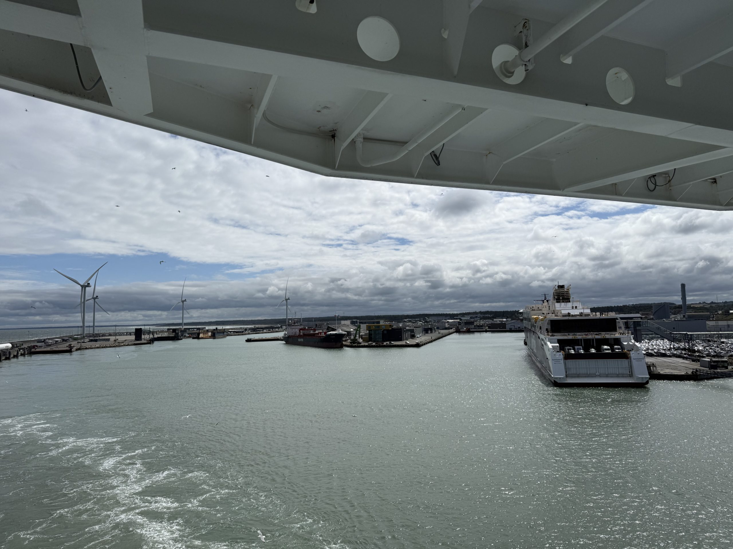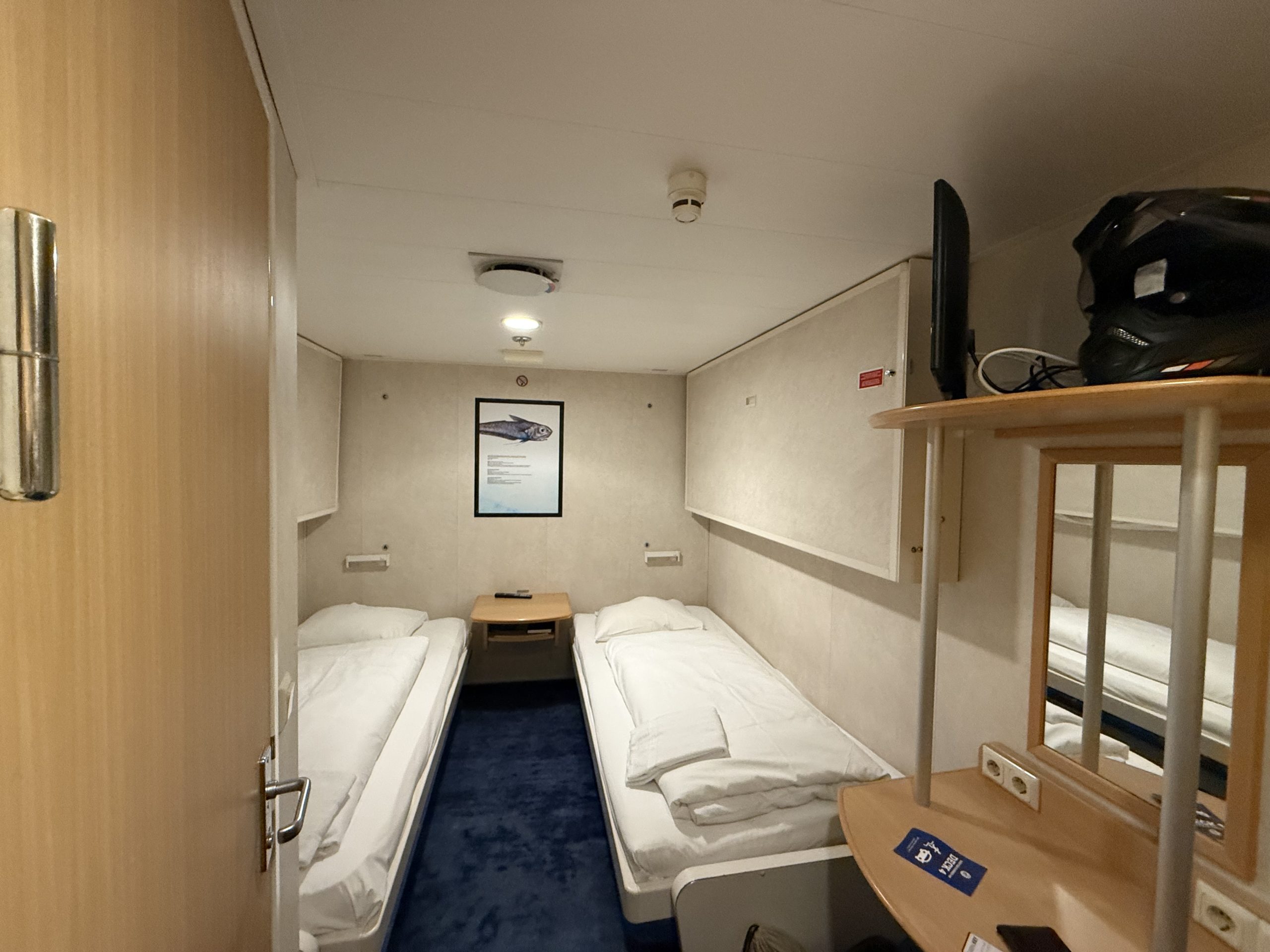 Eine Mischung aus spannender Vorfreude und Nervosität macht sich breit. Die 30 KM bis zur Fähre sind rasch absolviert und ich reihe mich in die lange Schlange der Motorräder ein. Der Check-in und das Boarding gehen zügig, so dass ich um kurz nach 10 schon auf der Fähre bin. Moped verzurren, Rucksack schultern und ab in die Kabine. Pünktlich um 11:30 heißt es Leinen los und ich bin auf dem Weg nach Island.