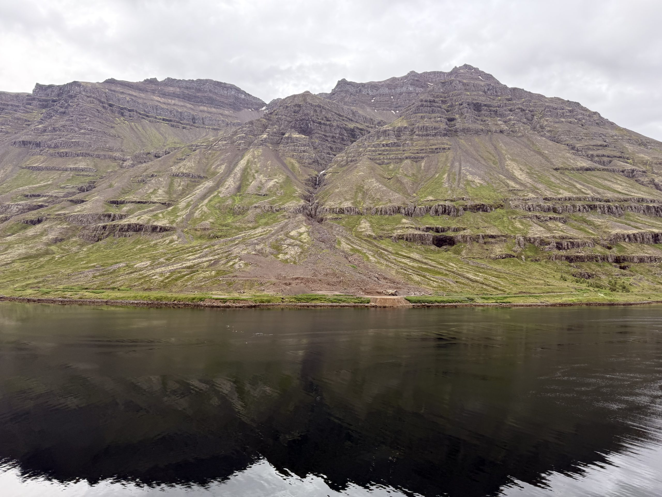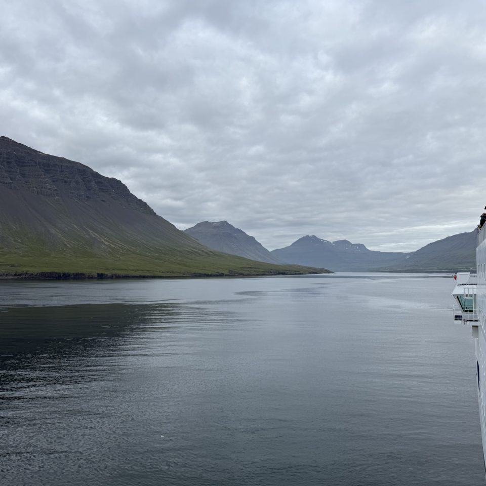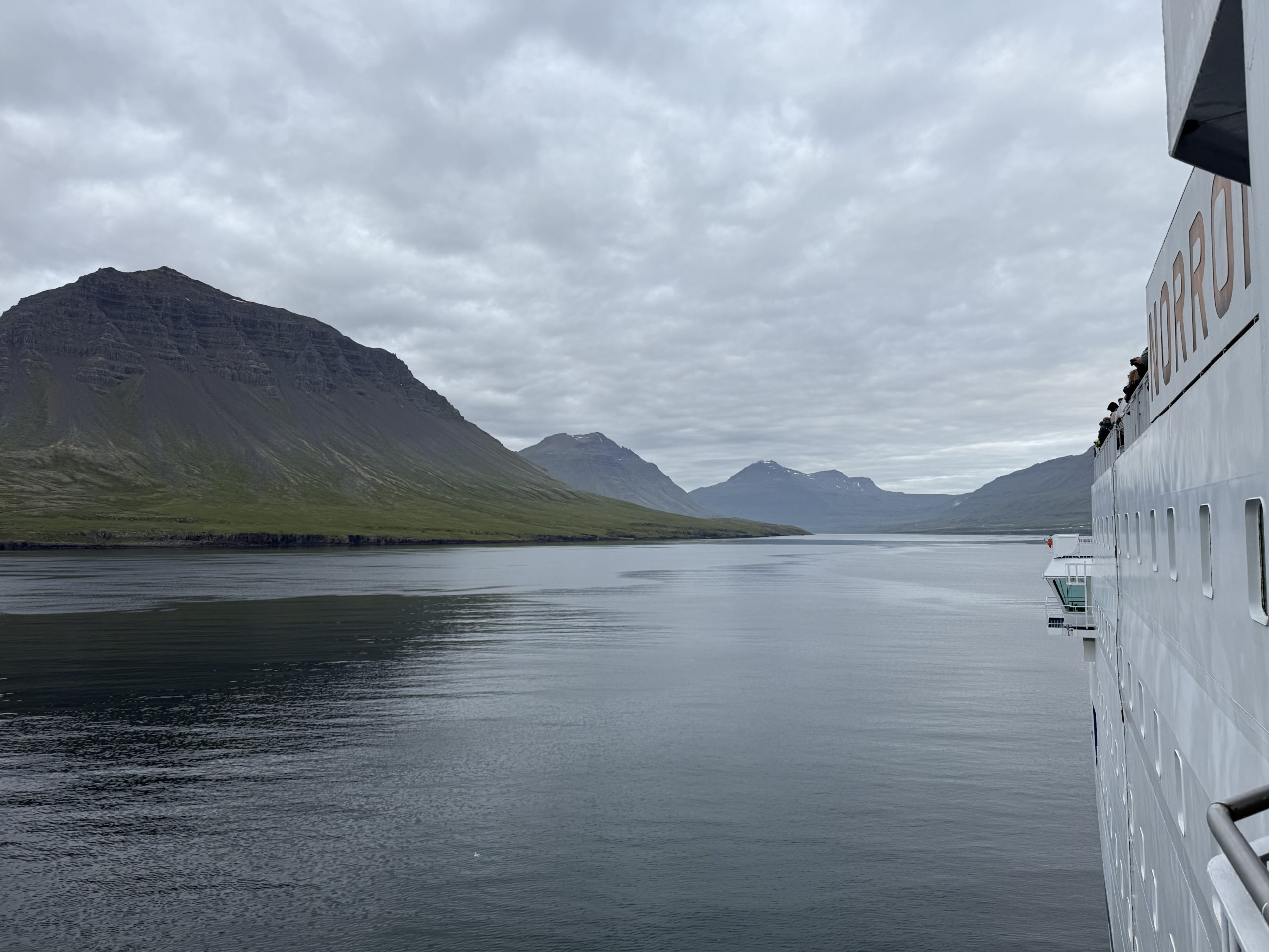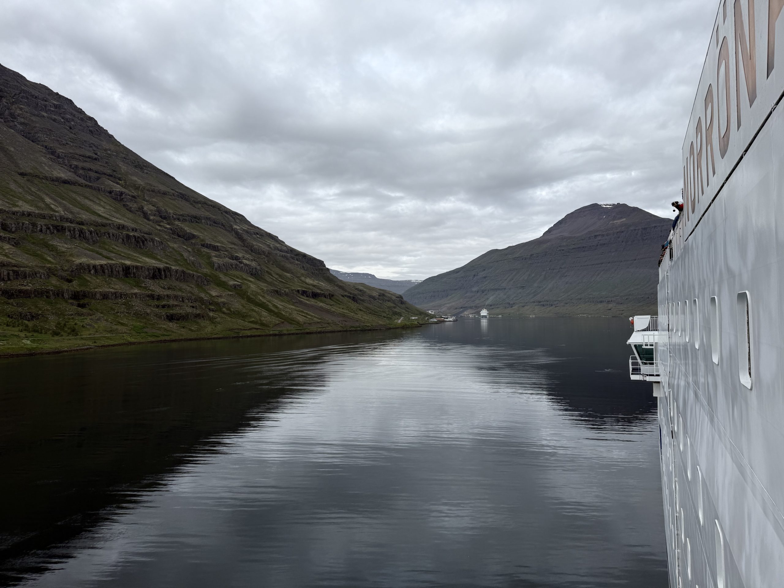 Pünktlich um 8.30 Uhr Islandzeit (also 10:30 MEZ) legen wir in Seydisfjördur an. Schon die Einfahrt durch den Fjord ist gewaltig und ich habe ein wenig feuchte Augen. Island präsentiert sich wahrlich von seiner schönsten Seite: Sonnenschein, angenehme 15 Grad und die Berge ringsum, die sich im brechenden Wasser spiegeln – einfach traumhaft.
