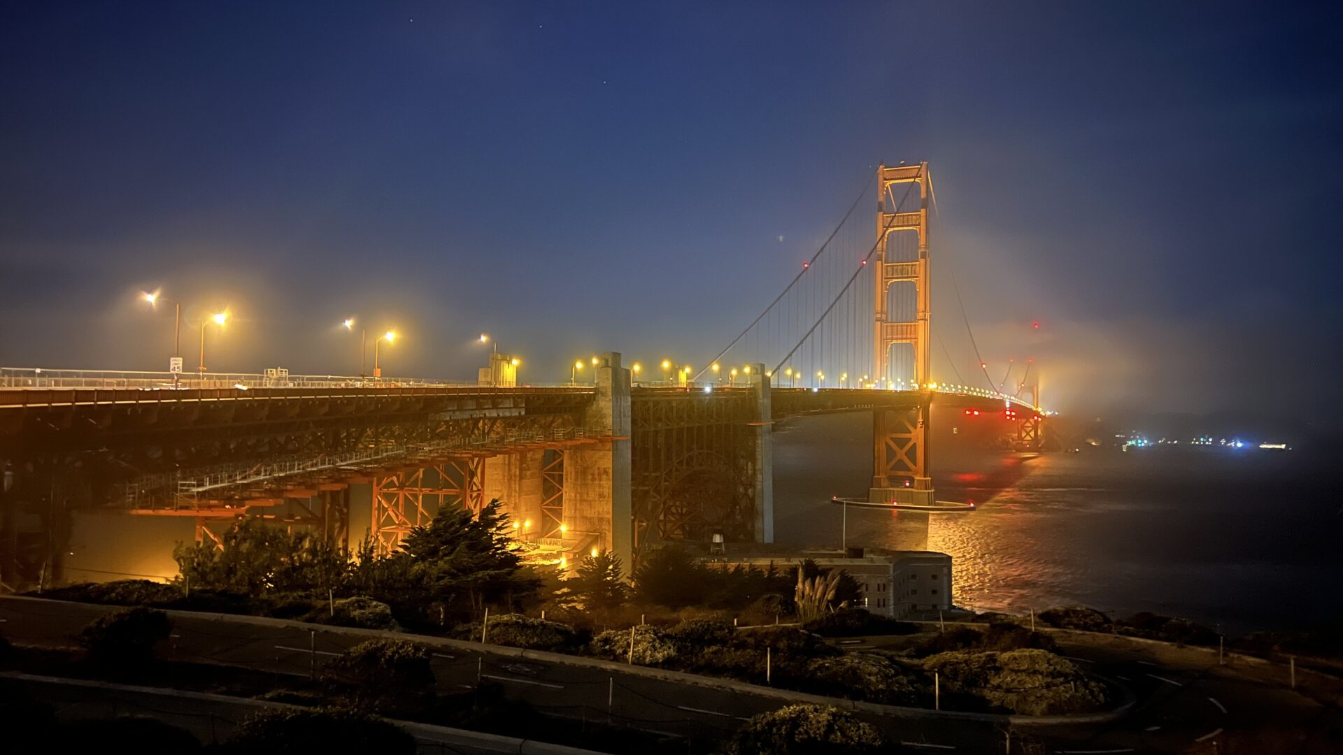 Zurück geht es wieder über die Bay Bridge, die wunderschön beleuchtet ist und weil wir noch Zeit haben fahren wir gleich nochmal zur Golden Gate. Bei Nacht hat die Brück nochmal ein ganz anderes Flair und verzaubert uns den Abend.