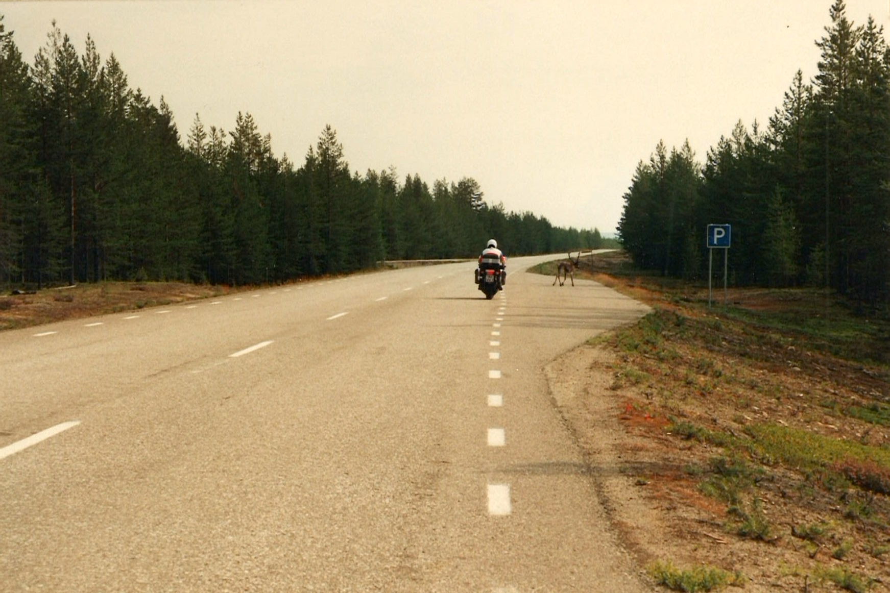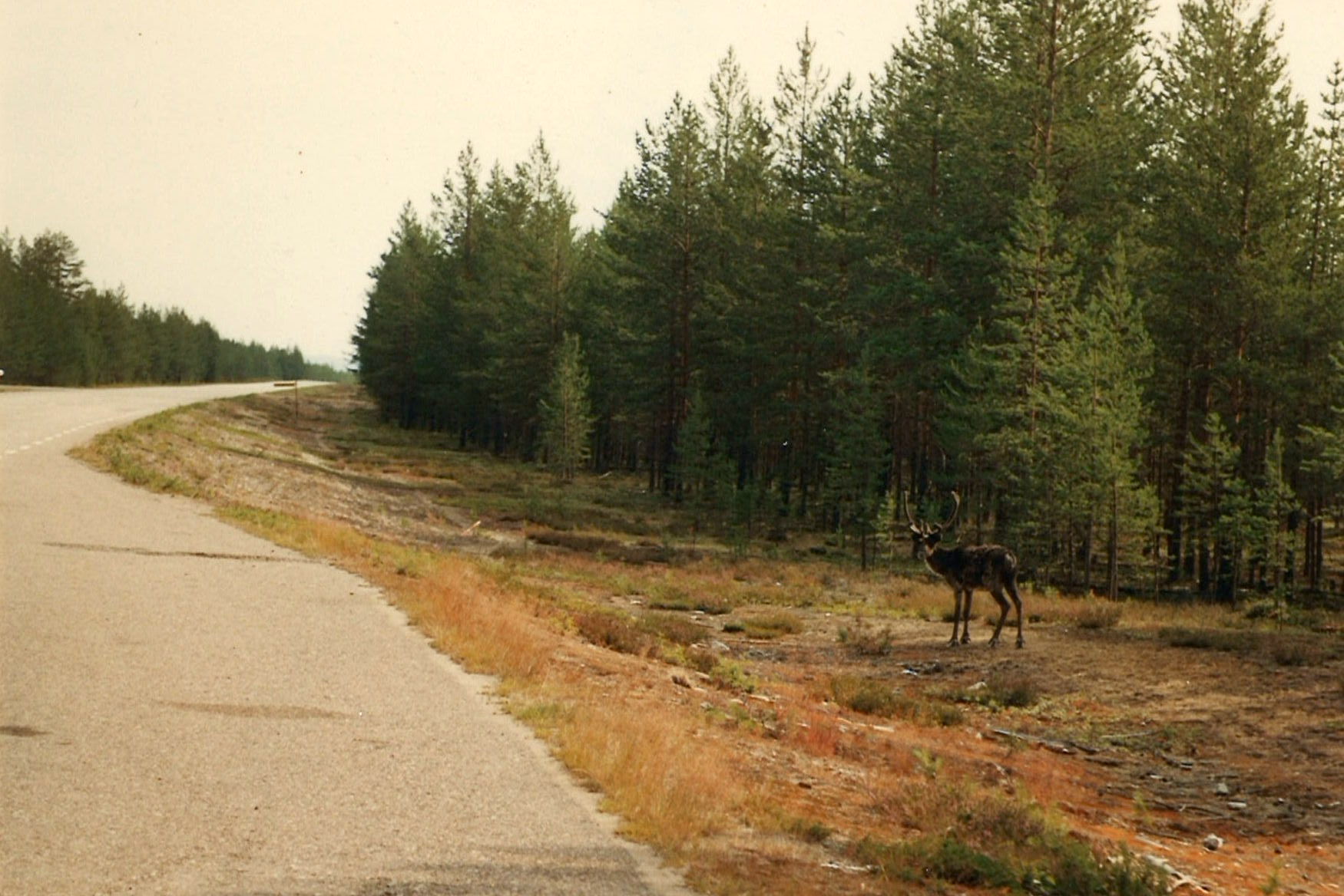 Kurz nach Vilhelmina kommt uns dann ein Geisterfahrer entgegen, und wir staunen nicht schlecht, als dieses Rentier sich uns mitten in den Weg stellt und keine Anstalten macht, auf die Seite zu gehen. Wir halten an (gezwungenermaßen) und ich nutze die Gelegenheit, um ein Foto zu machen.