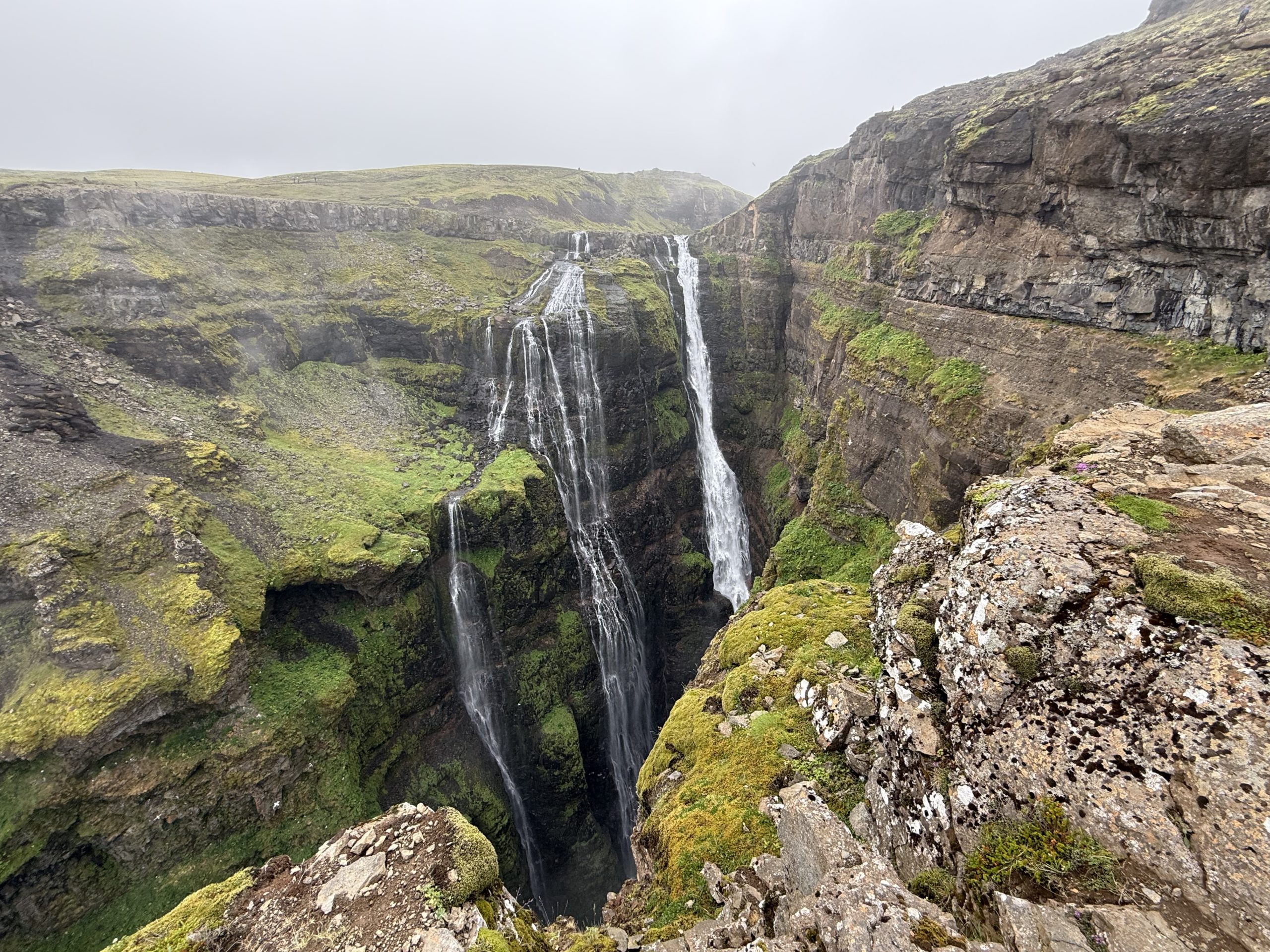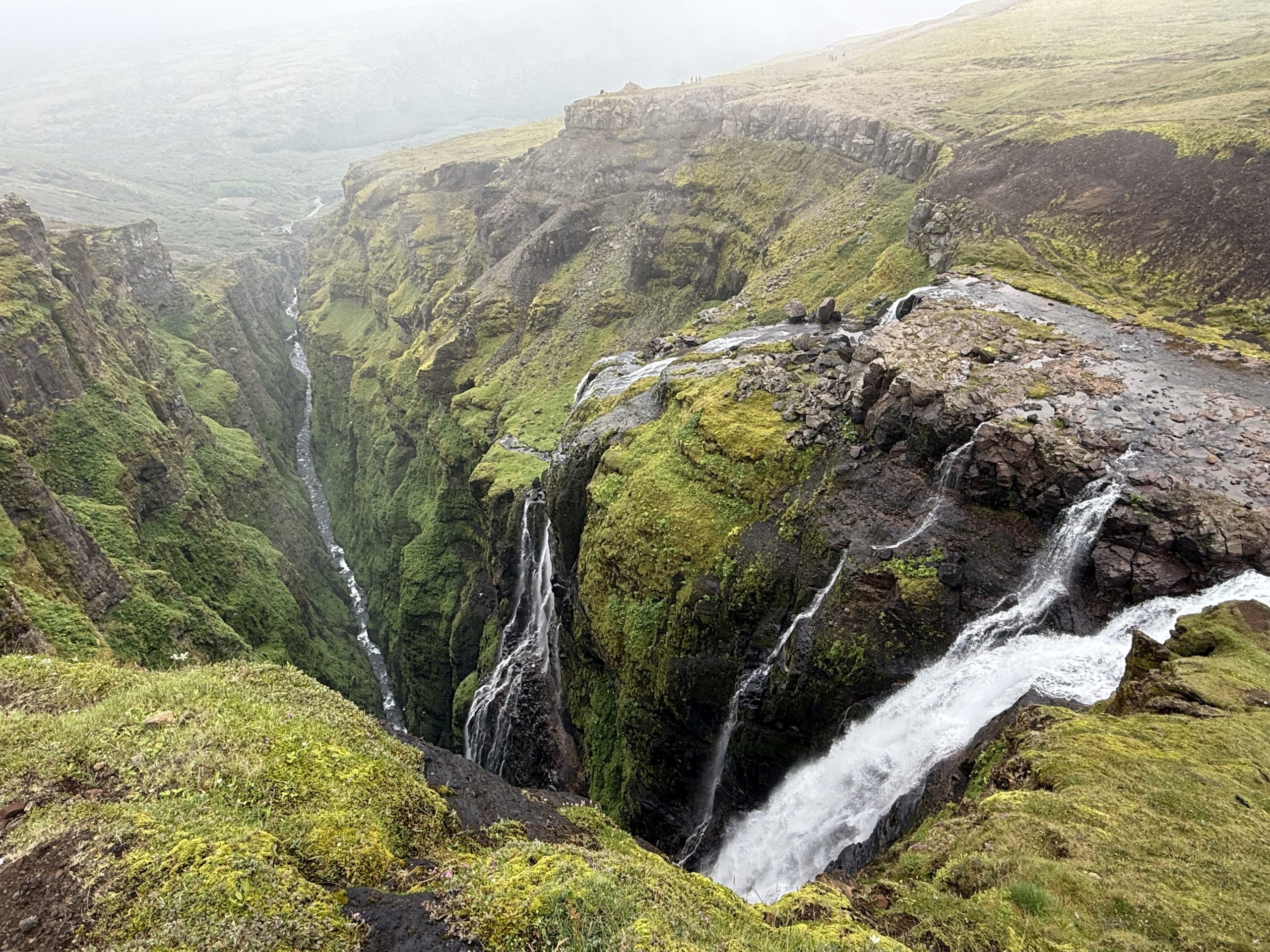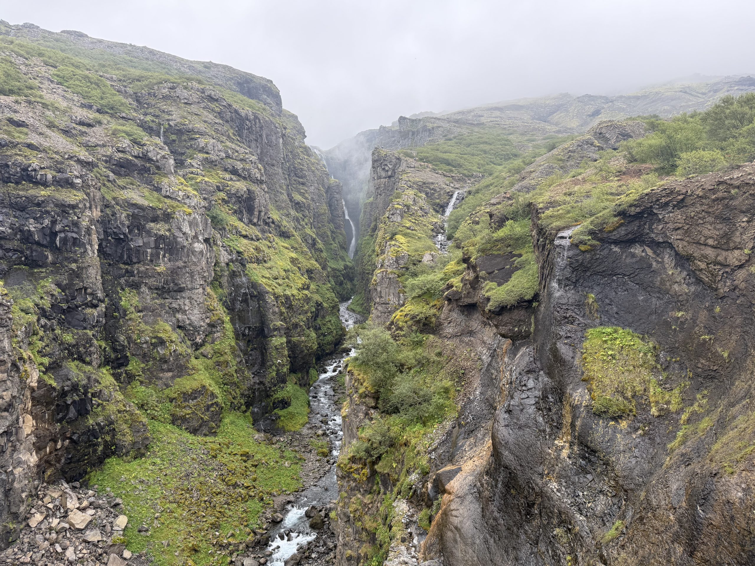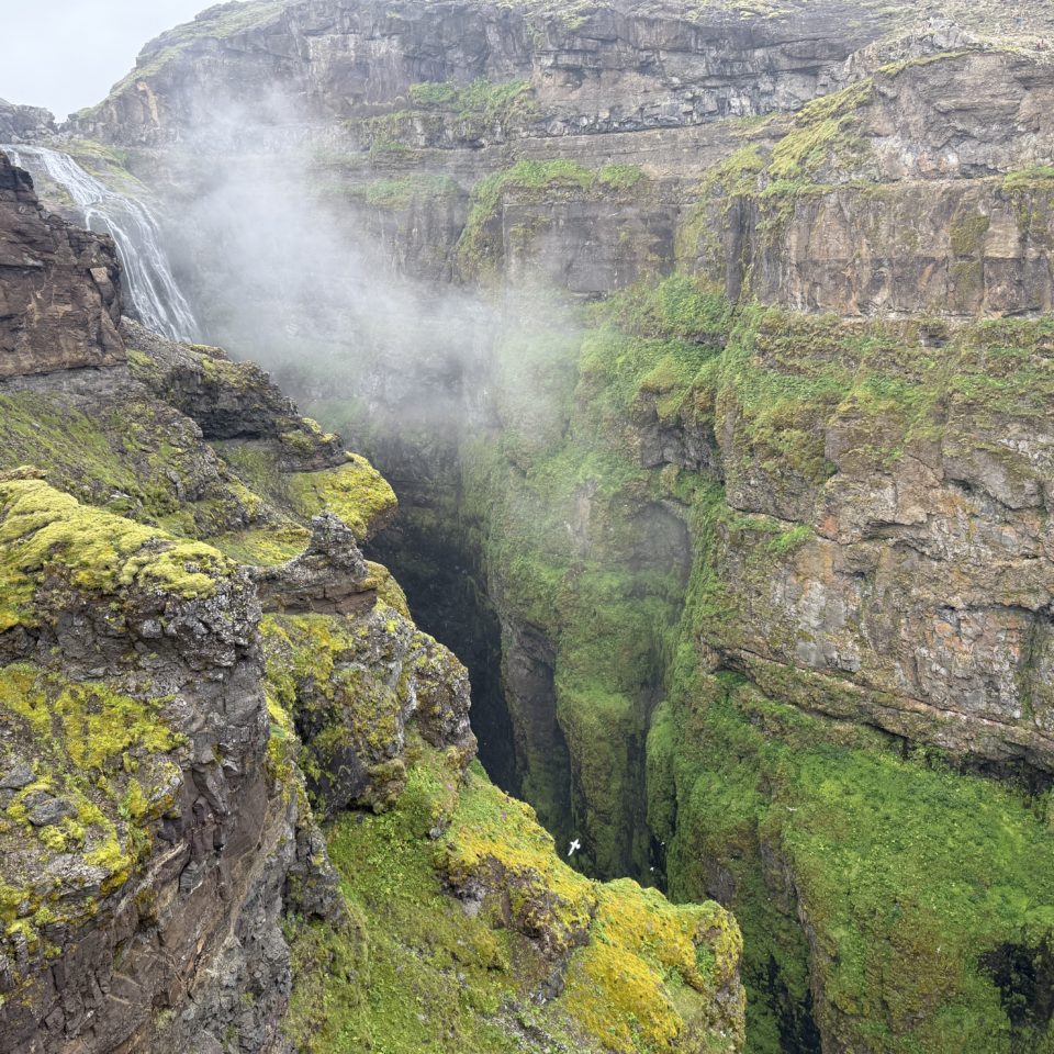 Dann aber das Highlight des Tages, wenn nicht der bisherigen Reise. Die Wanderung durch die Schlucht zum Glymur. Es ist einfach nur beeindruckend. Etwa 3 Stunden dauert die Wanderung durch und entlang dem Canyon bis zum Wasserfall. In der Schlucht nisten die Möwen und entsprechend viel Flugverkehr ist auch geboten. Gleichzeitig leuchten die schroffen Felswände teilweise in der intensivsten Grüntönen. Oben am Wasserfall angekommen heißt es dann Zähne zusammenbeißen: Der einzige Weg auf die andere Seite führt durch eine Furt über den eiskalten Bach und die 10 Meter bis zurr anderen Seite werden zum echten Härtetest. Dafür ist der Abstieg auf der Flanke über der Schlucht umso schöner.