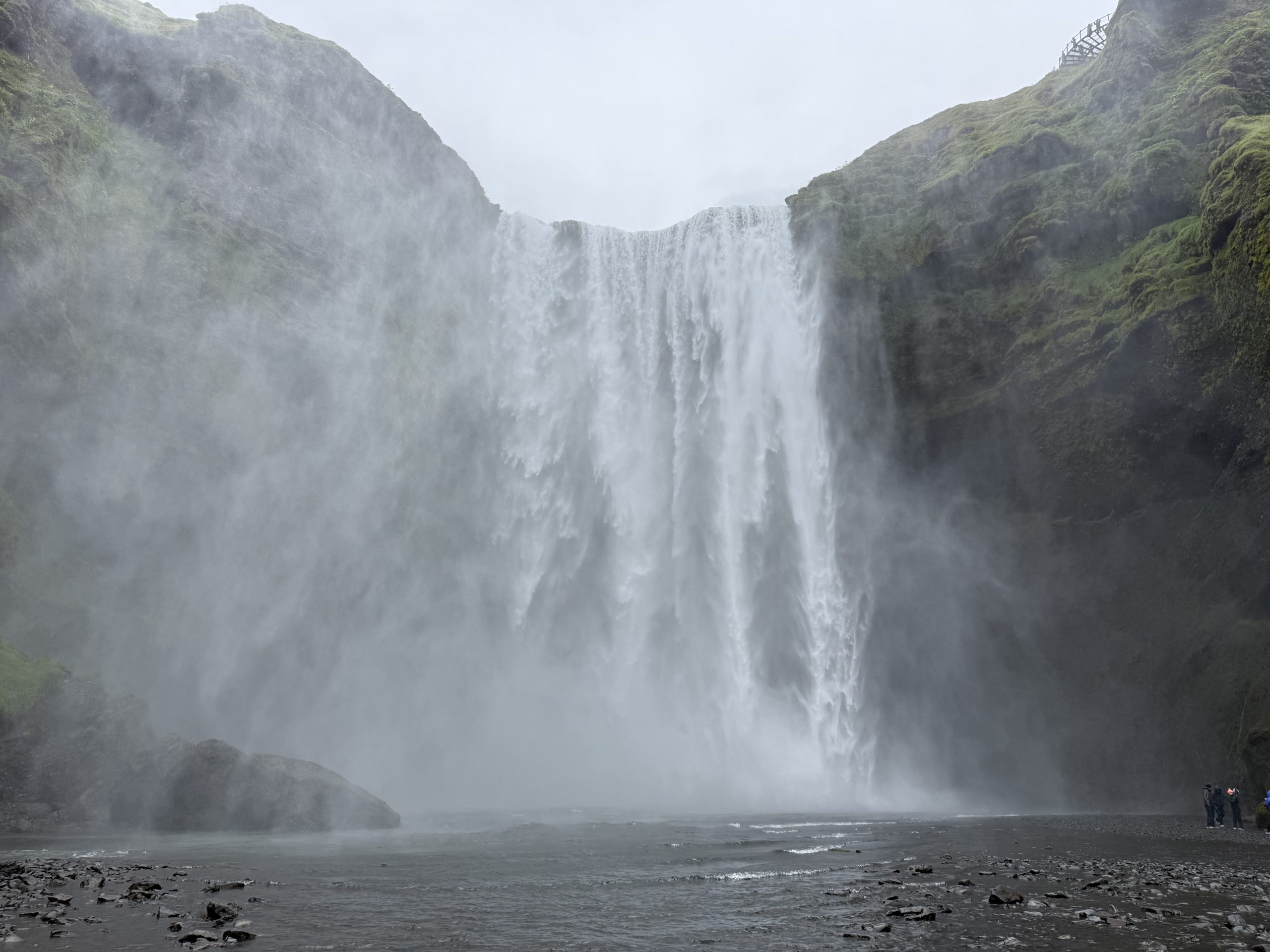 Nur wenige Kilometer weiter wartet schon der Skogafoss, der ebenfalls äußerst beeindruckend in einer großen Arena herunterkommt und nur durch einen kleinen Bach bzw. flachen Flusslauf zu erreichen ist. Theoretisch könnte man am Flusslauf entlang nach oben wandern, wo eine ganze Reihe weiterer kleinerer Wasserfälle wartet. Nachdem es aber langsam zu regnen beginnt, sehe ich von einer ausgiebigen Wanderung ab und fahre weiter in Richtung Gletscher.