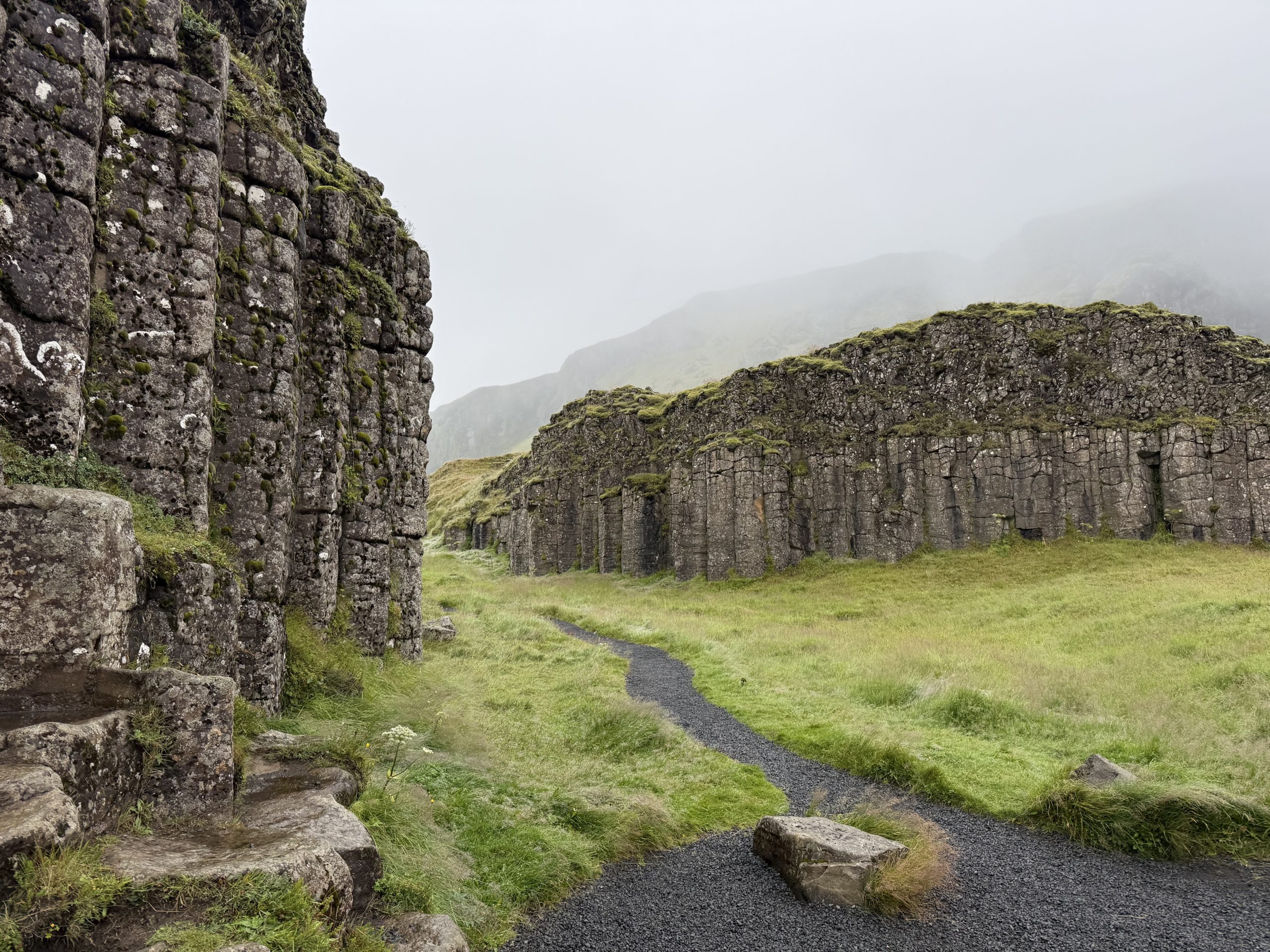 Nachdem es von oben schon nass genug ist, lasse ich die Wasserfälle an Straßenrand links liegen. Mein erster Stop sind die Basaltsäulen von Dverghamrar. Diese sind zwar bei weitem nicht so groß wie die im Norden, aber es ist eine schöne kleine Schlucht – gerade richtig zum aufwärmen.