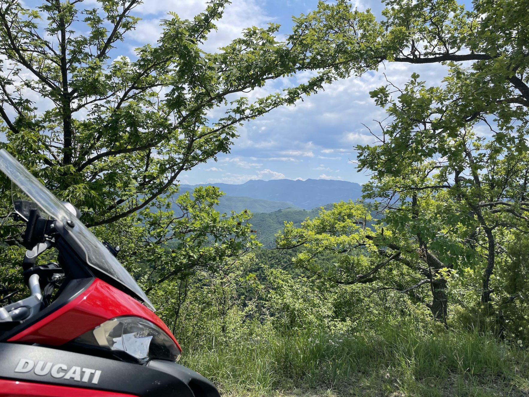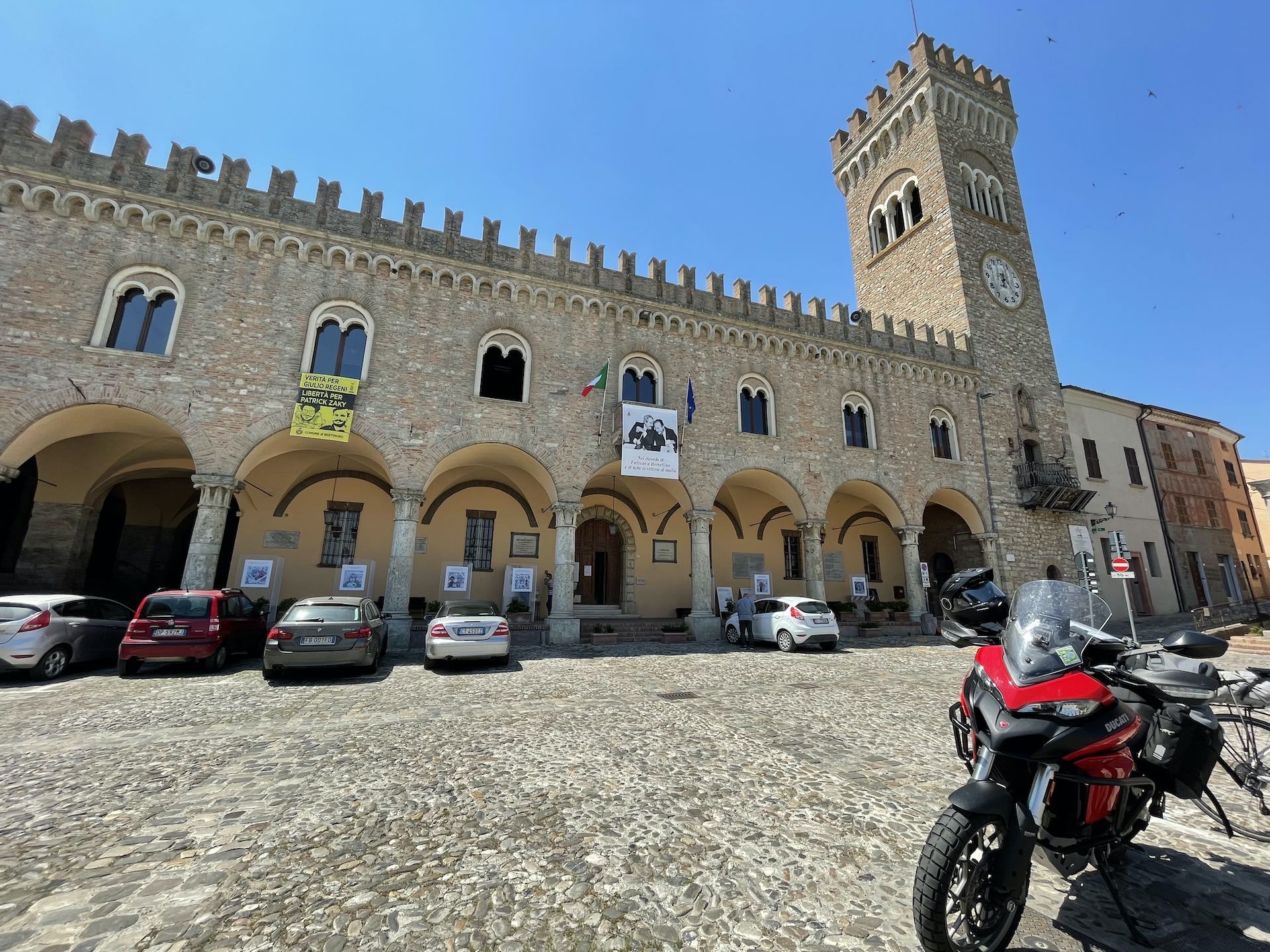 Um Punkt 9 Uhr heißt es heute aufsitzen und los geht´s zum Startpunkt des ACT – Adventure Country Trail – in Bertinoro. Dort komme ich ziemlich genau um Mittag an und genieße erst einmal die wunderschöne Altstadt sowie das herrliche Panorama. Auf kleinen, kurvigen Landstraßen geht es durch die Region. Auf vielen, teils auch durchaus etwas anspruchsvolleren Schotterwegen entdecke ich ein ganz anderes Italien. Ruhig, idyllisch und fast menschenleer. Außer ein paar entlegenen Bauernhöfen ist weit und breit nur unglaublich schöne Natur und immer wieder ein beeindruckendes Panorama. Die Strecke ist wirklich abwechslungsreich. Wenn trotzdem die Motivation mal nachlässt, feuert einen auch garantiert gleich ein laut bellender Hofhund an – aber zum Glück: Hunde, die bellen, beißen ja nicht.