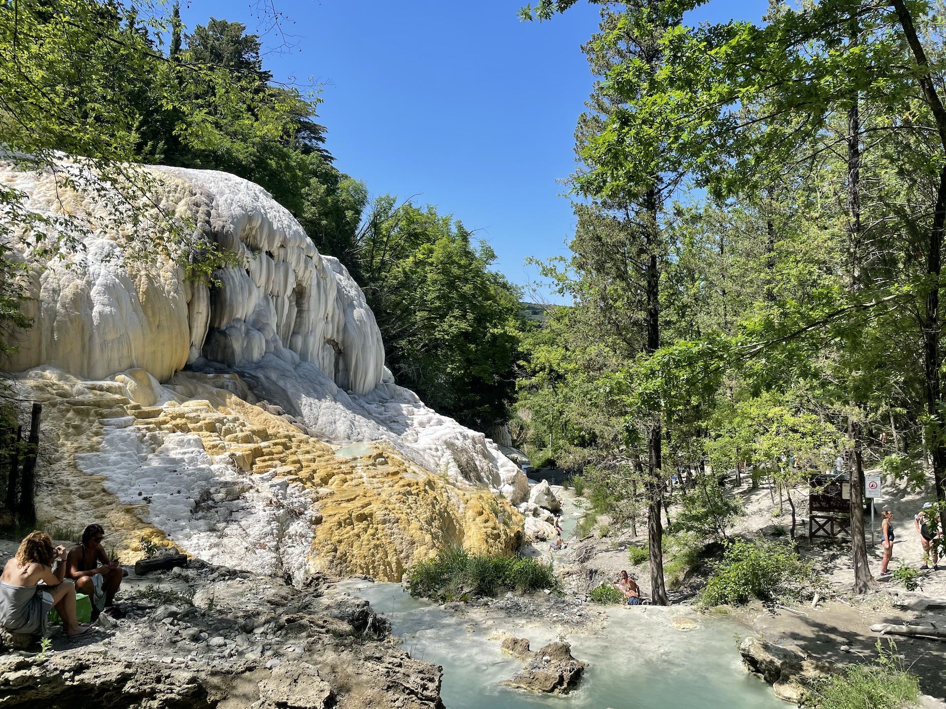 In Bagni San Filippo lege ich einen Zwischenstopp ein, um mir den „weißen Elefanten“ anzusehen. Schon von weitem ist die Schwefeltherme zu riechen und je näher man den Badegumpen kommt, desto intensiver wird der Geruch – da hilft auch die FFP2-Maske – die Covidbedingt vorgeschrieben ist – nichts mehr. Umso eindrucksvoller ist der kleine Bachlauf mit seinen natürlichen Terrassen und vor allem die riesigen Schwefel-Sinter-Ablagerungen, die tatsächlich ein wenig wie ein großer, weißer Elefant aussehen. Wenngleich mich eine kleine Abkühlung wahnsinnig reizt, wiederstehe ich und kühle mich stattdessen im Schatten einer kleinen Bar ab – den Schwefelgeruch hätte ich sonst vermutlich nicht mehr aus den Motorradklamotten rausbekommen.