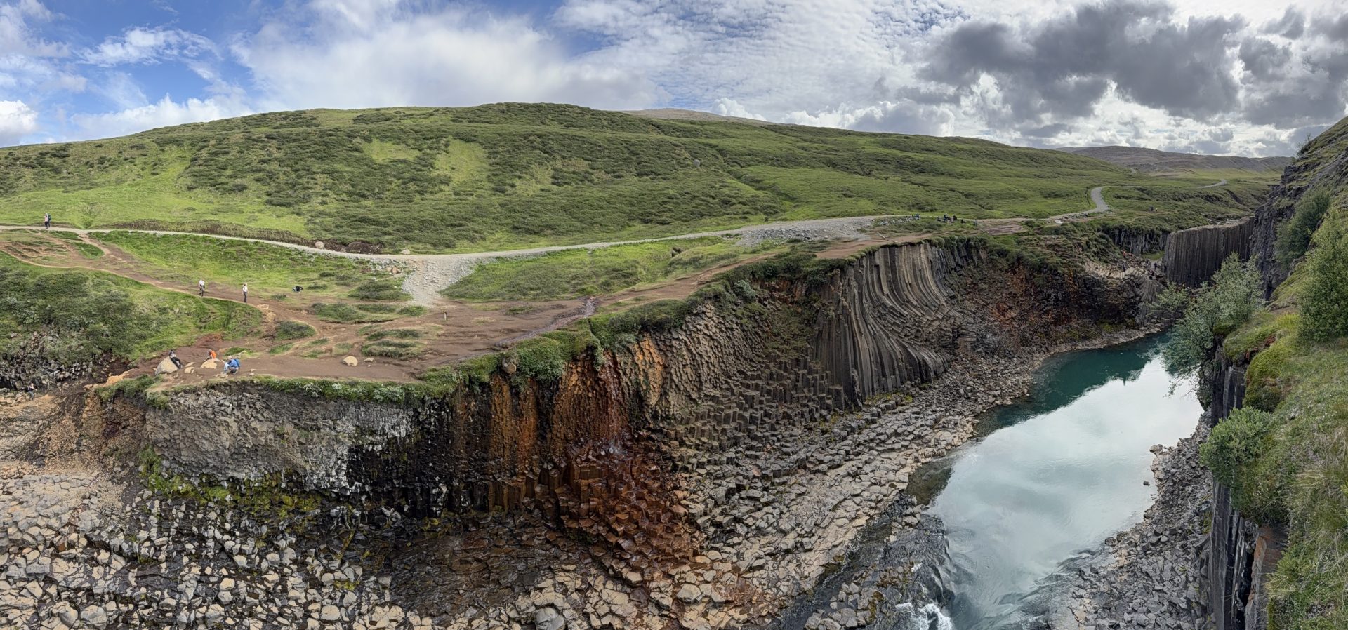 Schon die ersten Meter auf Island sind traumhaft. Leicht gewunden zieht die Strasse vom Hafenort hinauf Richtung Egilssadir, vorbei an den ersten Wasserfällen und mit traumhaftem Panorama.