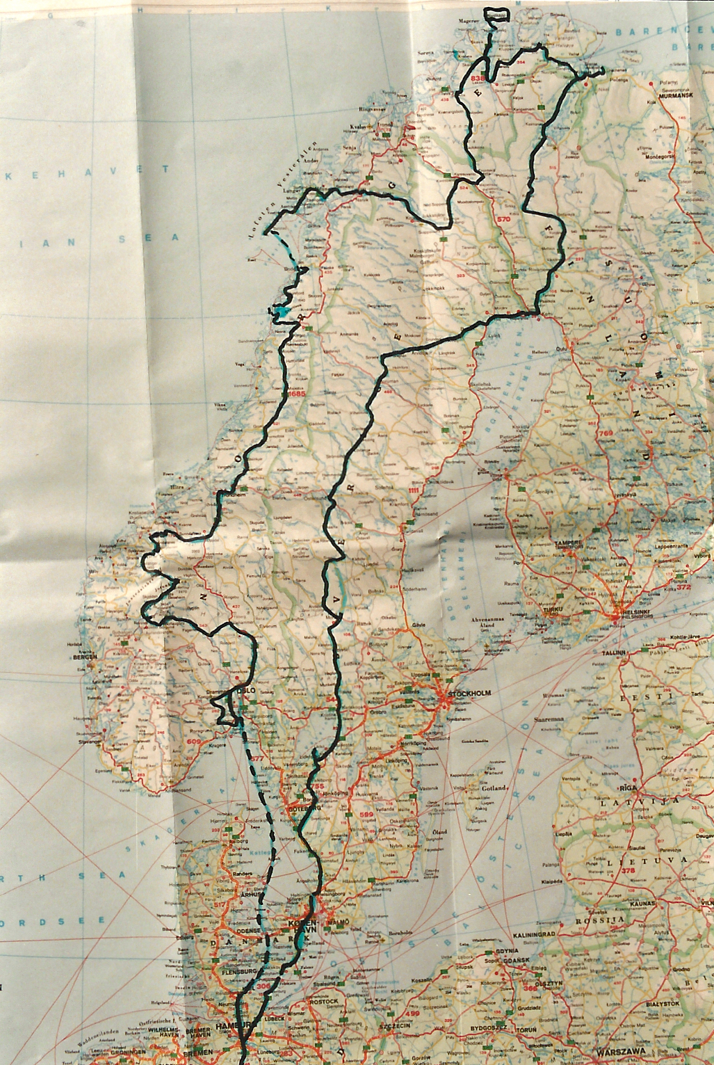 Und so sollte die Tour aussehen: Über Dänemark, die Vogelfluglinie nach Schweden und über Oslo an die norwegische Küste hoch bis zu den Lofoten und zum Kap. Zurück dann über Kirkeness nach Finnland und mit der Finnjet als krönenden Abschluss zurück. Aber es sollte dann doch noch ein paar Änderungen geben – wie ihr auf der Karte sehen könnt – aber dazu später.